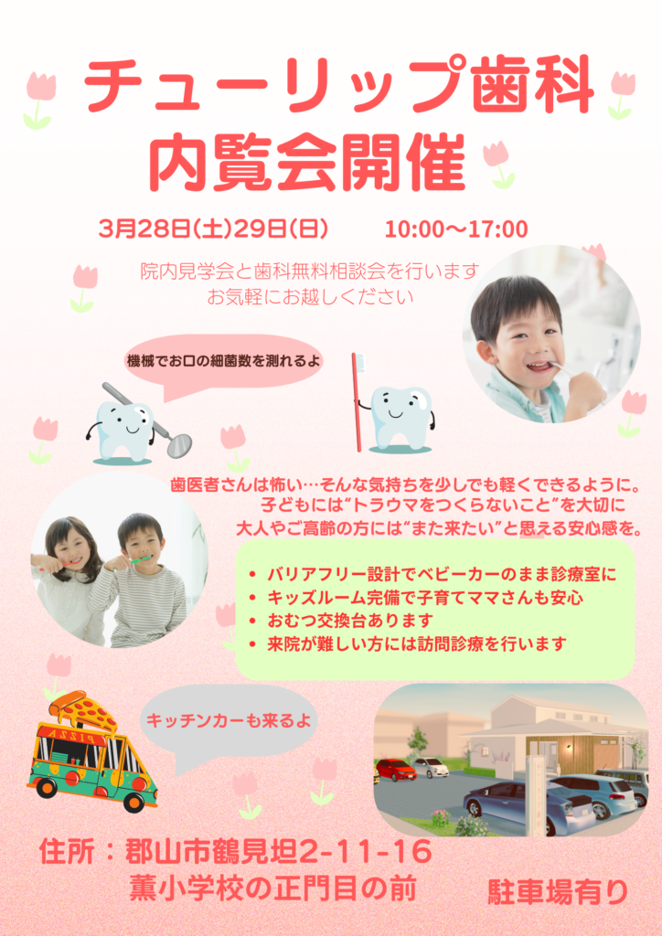 このたび、チューリップ歯科は開院に先立ち、地域の皆さまに院内をご覧いただける内覧会を開催いたします。